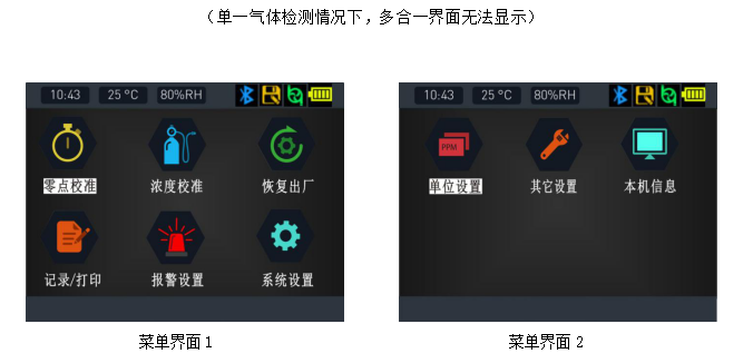 ●高清2.5英寸彩屏顯示實(shí)時(shí)濃度、報(bào)警、時(shí)間、溫度、濕度、存儲(chǔ)、通信、打印、電量、充電狀態(tài)等信息,菜單界面采用高清仿真圖標(biāo)顯示各個(gè)菜單的功能名稱